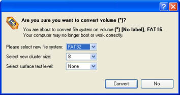 3. Define parameters of the operation with the Convert file system of partition dialog. Initially the program suggests some consistent values for all parameters. In most cases, the user may just press the Convert button to confirm the operation.