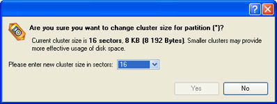 - Select in the Main menu: Partition > Modify > Change Cluster Size…