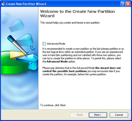 - On the Common Tasks bar: click the Create Partition item of the Wizards menu.