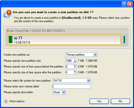Define the future partition parameters with the Create Partition dialog. Initially the program suggests some consistent values for all parameters. In most cases, the user can just press the Yes button to confirm the operation.