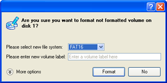 Define parameters of the formatting operation with the Format Partition dialog. Initially the program suggests some consistent values for all parameters. In most cases, the user can just press the Format button to confirm the operation.