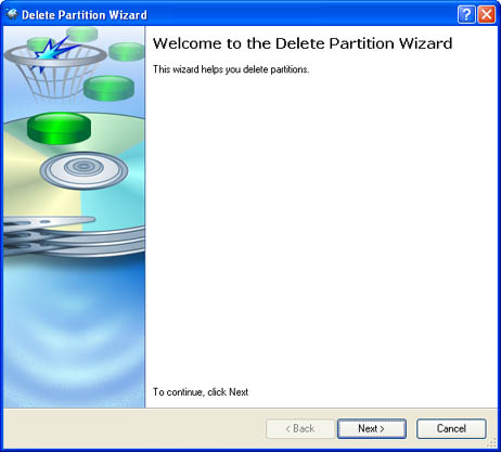 - On the Common Tasks bar: click the Delete Partition item of the Wizards menu.