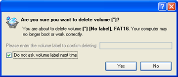 - Do not ask volume label next time. Mark the option to inhibit confirmation of the partition deletion.