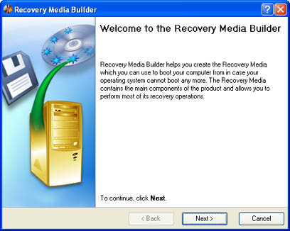 CD, DVD or floppy disks). The tool set can be of assistance in case of operating system corruption, which means that the user is able to boot the computer even when the operating system is not able to do so. Creation of such recovery tools is performed with the Recovery Media is a CD/DVD disc, a USB flash card or even a floppy disk from which you can boot for maintenance or recovery purposes. Wizard.