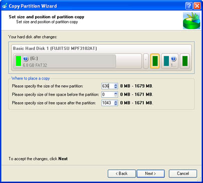 - Copy the partition with resize. This option gives the possibility to copy the partition to a block of free space, which is smaller than the partition itself.