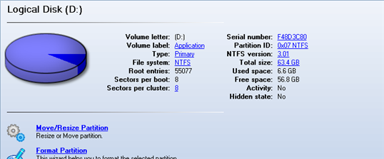 When the user selects a small-sized bar (i.e. corresponding to a logical disk), the Explorer bar will display information on it as well. The page title will contain a drive letter, which is assigned to the disk. The disk layout graph will be colored in accordance with the volume ratio of the used space to the free space (the light colored sector).