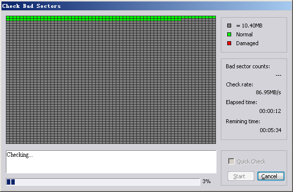 For a formatted partition, the Check Error can discover some errors of the file system to ensure the integrity of your data files. And on a disk or any partition, the function will scan each disk sector status by reading data from the sector.