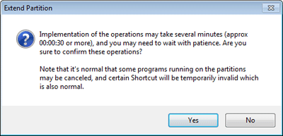In the "Hard Disk Layout" page, you will preview the changes, and you need confirm the extending operation by clicking the Proceed button. Here will popup the following message box to tell you how long the operation will take.