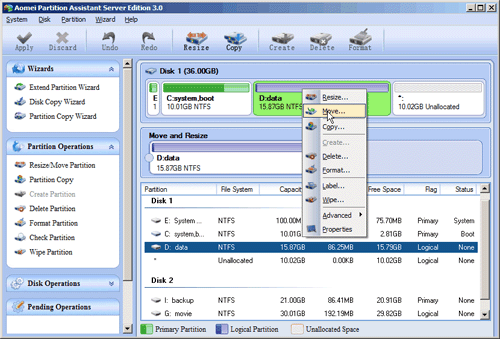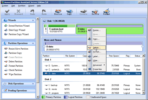 Specially developed for Windows server 2003/2008/2000, Aomei Partition Assistant Server Edition is a powerful partition magic server for server and advanced users to manage both server and non-server disk partitions properly and optimize server performance. Currently, this partition magic server is largely employed by small and medium-sized companies, college labs, institutions, and administrative organizations.