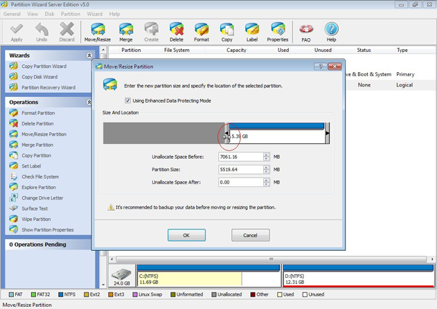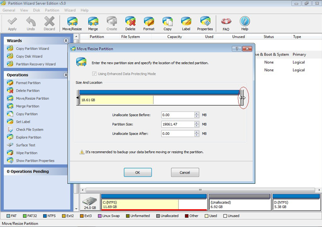 3. Extend partition C by drag the partition edge to its right and click OK.
