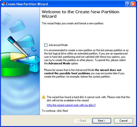 By default, the program allows the user to Create a new partition only as the last primary or as the last logical drive within the extended partition. However, by activating the advance mode on the first page of the wizard you can remove this restriction that in its turn might result in some boot problems.