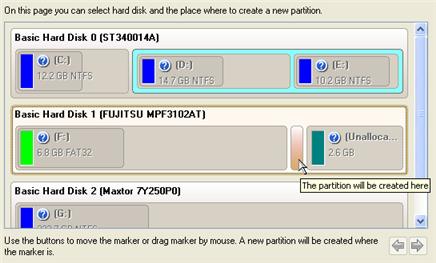 1. Partition destination. Select a hard disk (if the computer has several hard disks) and then choose position for the future partition on the disk: at the end (preferable), at the beginning or somewhere in the middle between other partitions.