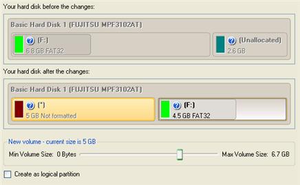 If there is not enough free space in one block, the wizard enables to redistribute free space, joining all free space blocks together into one united block and moving partitions when necessary. If the total amount of free space is still not enough, it is possible to split a fragment of space from one of the existing partitions, thus resizing it.