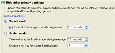 14. Set up the Boot Manager wizard. The most relevant option here is the possibility to hide other primary partitions except the one selected to boot and it is by all means should be activated to make Windows Vista and Windows XP unaware of each other. The rest of the parameters offered by default will do in our case, so just complete the wizard and it will automatically find the two operating systems and update the MBR.