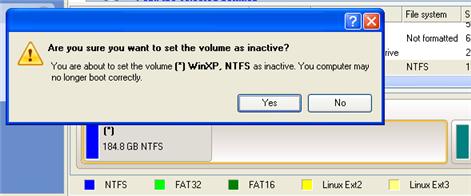 1. Besides hiding of the system partition before installation of the second OS you need to make it inactive as well. To do that, please call the context menu for it (right click of the mouse button) and launch the corresponding dialog. Click the Yes button to continue;