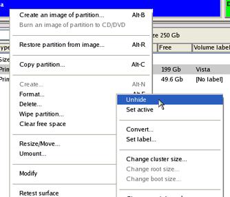 5. Unhide the partition by calling the context menu for it (right click of the mouse button) and then selecting Unhide;