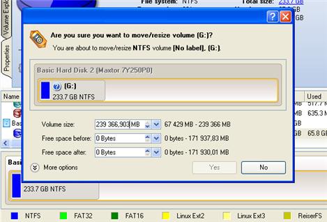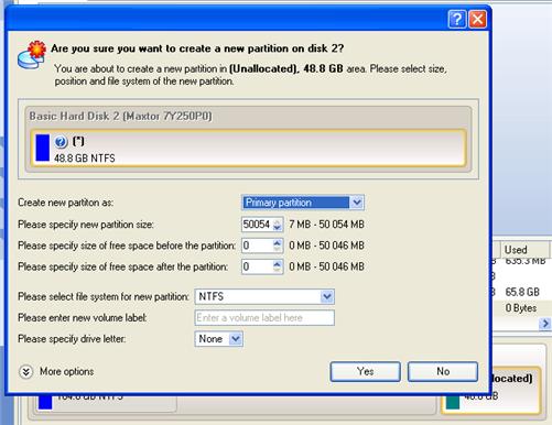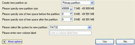 7. Define parameters of the future partition. By all means it has to be primary and since we are going to install Windows XP, the most preferable file systems are NTFS and FAT32. Click the Yes button to continue;