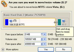 4. In the opened dialog shift the edge of the partition to the left by the drag-and-drop technique. While doing this, free space from the partition will be released (displayed in aqua-green). You can also do it manually by entering the exact size of free space. Click the Yes button to continue;