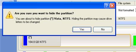 9. Hide the Windows Vista partition to avoid writing any data on it during the Windows XP installation, as it is the best way to provide system independence. To do that, please call the context menu for it (right click of the mouse button) and launch the Hide Partition dialog. Click the Yes button to continue;