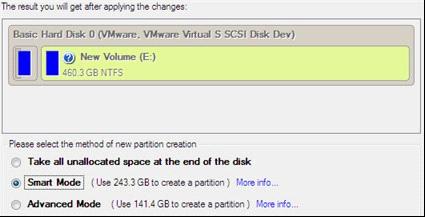 3. Choose a method you find the most suitable to create the partition. The wizard is especially designed to minimize your participation in finding an appropriate place for it and its resulted size. The only thing you're to do is to choose between several modes. The most relevant thing here is the amount of space that will be allocated for that partition. For easy perception, you can see the resulted disk layout on the disk map by selecting this or that mode.