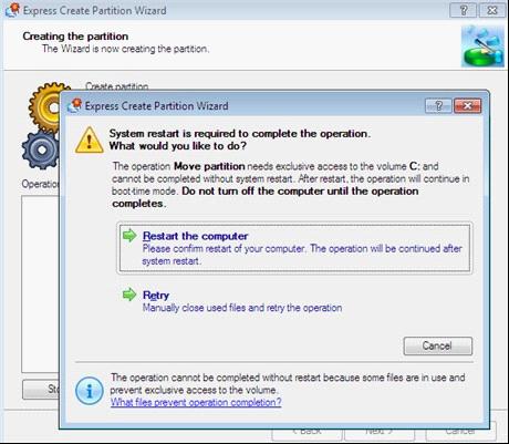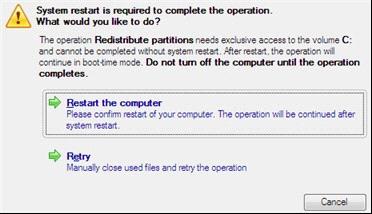 4. That's basically it. By clicking the Next button the wizard will start modifying your disk layout. If you've got to do with the system partition resize, like we do in our case, you will be asked to restart your computer in a special boot-up mode to accomplish the operation. So click the appropriate button to agree.