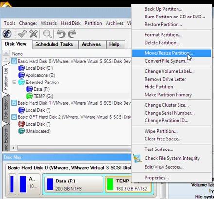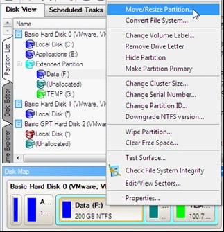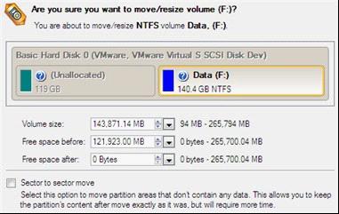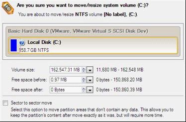 12. Finally increase size of the system partition. Call the context menu for it (right click of the mouse button) to launch the Move/Resize dialog.