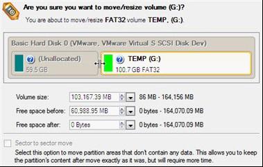 7. At first shift the right edge of the partition to the right, then do the same with the left edge. Make sure the partition size has been left unchanged.